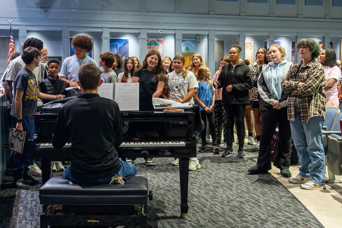 In the chorus room down the hall, sophomore Cayden Bristow sits at a piano and runs through music scales with a protege. In the lobby, Hayden Crum and Jae Saunders work on a dance scene with two performers. And on stage, senior Livia Rocco and recent Woodland Hills graduate Gia Zinn plot out the choreography of a scene.