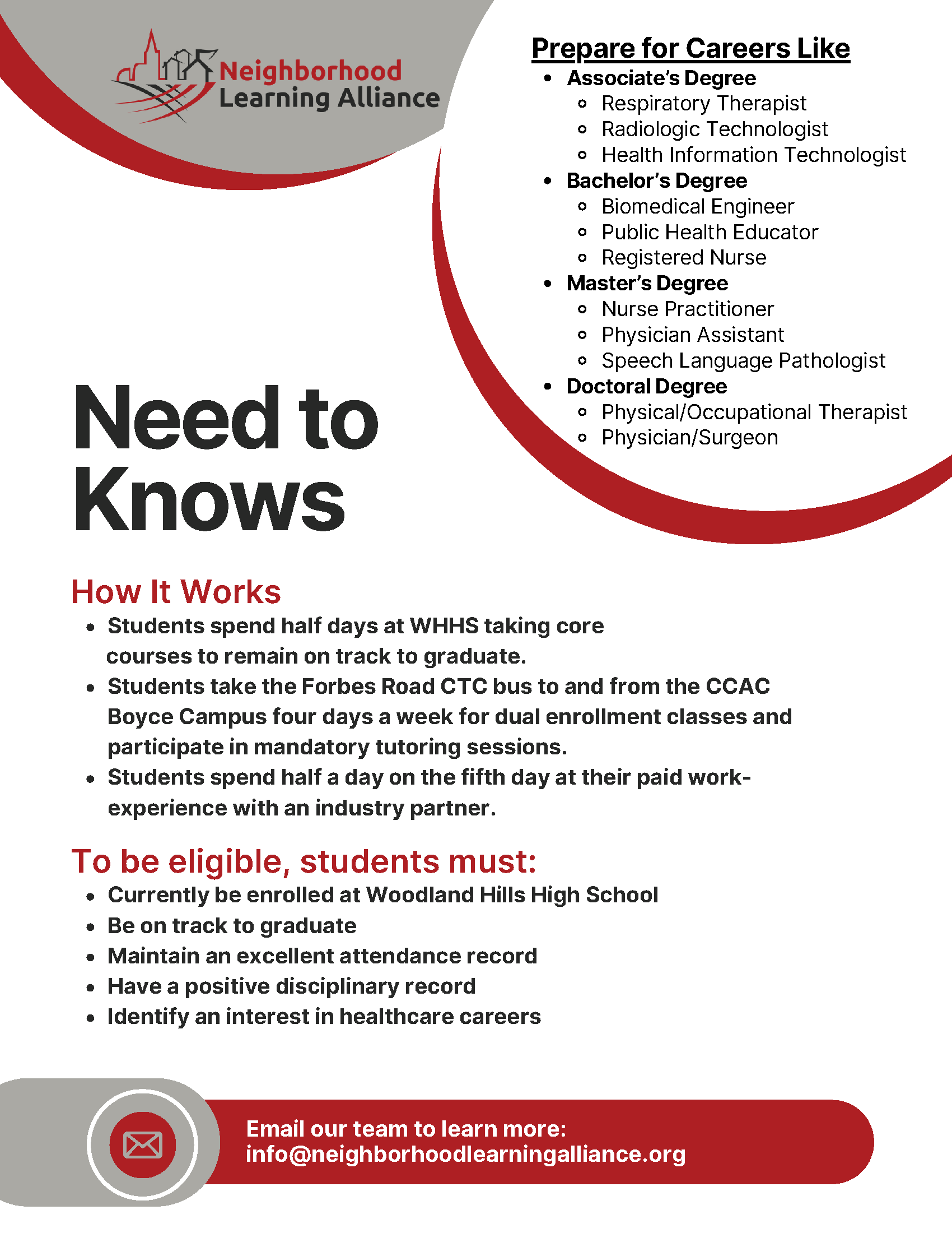 Students must be currently enrolled at Woodland Hills High School, on track to graduate, maintain an excellence attendance record, have a positive disciplinary record, and express an interest in a healthcare career.